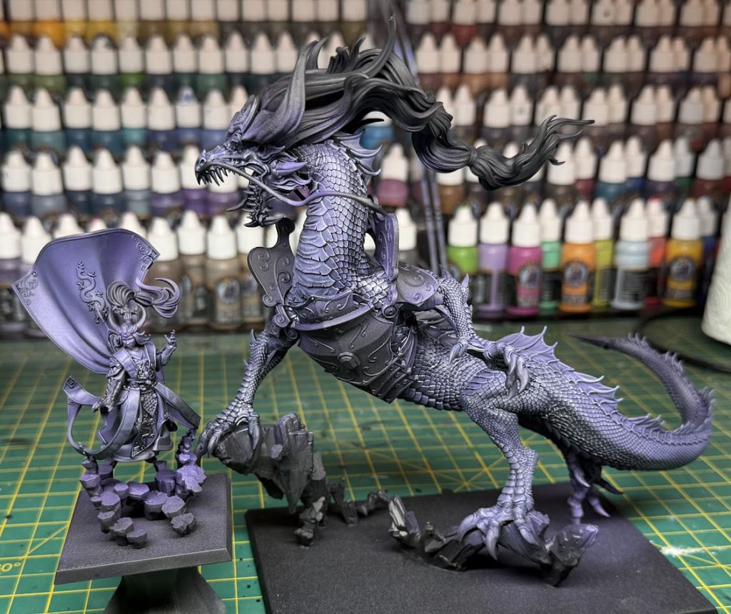 After priming black, I set about with some purples to produce a black to purple gradient on both the dragon’s scales and human Miao Ying’s robes. Purple is definitely the focus colour here, so it’s worth putting in some extra time. On the human form I finished this off with some gentle layering to smooth some transitions, and a couple of edge highlights. On the dragon form I drybrushed all over