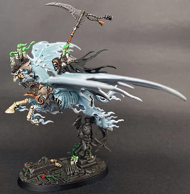 The one Heroic Trait Silent Overseer lets you pick three units wholly within 12” who can then retreat and charge. Pairs great with Spectral Swiftness. The Talisman of the Nadir artefact lets you unbind a spell targeting a unit within 12” of the bearer, with a +1 to unbind at that. Given how rare Unbinds are and the fact you lose Banshees in this detachment, appreciated. For spells you get two great spells for cavalry: Spectral Lashes grants +2” to movement and Fell Riders grants a Reroll Run and Charge rolls to a unit, both to a unit wholly within 12”. Then for your manifestation, you get the Shyish Reaper.