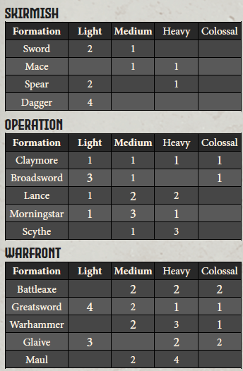 When assembling your squadron of rigs you'll want to start with a nice, small, easy Skirmish game to get to grips with the rules and without any Heavy mechs having rules at this point the choice is pretty easy between a Sword, Dagger, or Spear formation. Sword seems like a solid little all-rounder type but going all in on just four little rigs is very cool and for the faster factions probably quite good, too. For Operation games at the moment you'll be stuck just playing Broadsword formations, there's probably scope to just grab a few mechs and have fun though if you wanted to field Just-Mediums for example and chat with the person you're playing with about what they'll field against that.