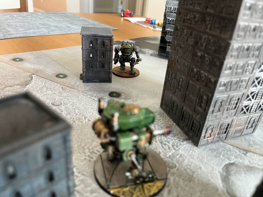 A game using the current Alpha edition of the rules took a little more than an hour, with both players fielding two Light and one Medium Rigs each on a 30” x 24” board. The rules are slimmed down enough that there wasn’t a lot of flipping through pages trying to find answers to edge cases. In the first game we were a little confused at how to apply damage done in a single attack beyond what was needed to take a component to zero structure points. We applied it as “additional damage” as noted above, which meant Rigs were getting destroyed very easily. In a second game we decided that the excess damage would evaporate (like excess damage when void shields go down in AT), and a further attack dealing damage to that component would be needed to push the Rig to big badda boom. This second way felt more satisfying and gave multiple components the chance to go to zero, adding to the tension. The right way to apply the damage will no doubt be clarified in future iterations of the rules.