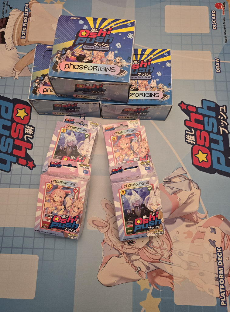 As I mentioned, Oshi Push was a Kickstarter that Japanime Games funded successfully and then worked on delivering; like many Kickstarters and especially those in the Tariff Era, things certainly got a little hairy, so one of my other reasons to slow roll my review was to see something that truly influences my recommendation of just about any game: availability. So, back in November of 2025, I was pleasantly surprised to walk into my local TGS and see, in great supply, numerous boxes of Oshi Push packs and even a playmat, along with people already looking to organize local play and try the game out. Because while TCGs can be fun to mess with in a vacuum, but having no easy way to grow a collection or pool of potential players is always the number one way to get me to try something out and then move on. This is especially true to collectible products, because the ability to get cards that I’m missing in order to make playsets or construct a deck without having other players who aren’t seeking to just profit off of chase cards can be a nightmare (this is the primary reason why I gave up on One Piece).