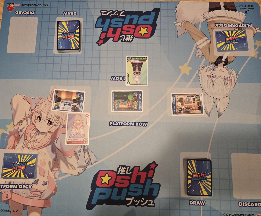 Oshi Push relies on players assuming the role of managers of a Persona, represented by a VTuber, and your goal is to help your particular representative accrue 1 million fans before the opponent does. Since both of you are competing for viewers and attention, the conflict in this game doesn’t take quite the same form as combat focused TCGs; you aren’t going to be directly smashing your talents into one another during Magic style combat phases, but instead looking to play the board in order to try and win control of three contested objectives referred to as Platforms. This was one of the first things that made Oshi Push click with me, but also with my partner; while you can indeed directly compete over Platforms, you can also choose to move strategically, trying to build up your influence across the board or moving to where your opponent isn’t, or similarly looking to block them from gaining a win.