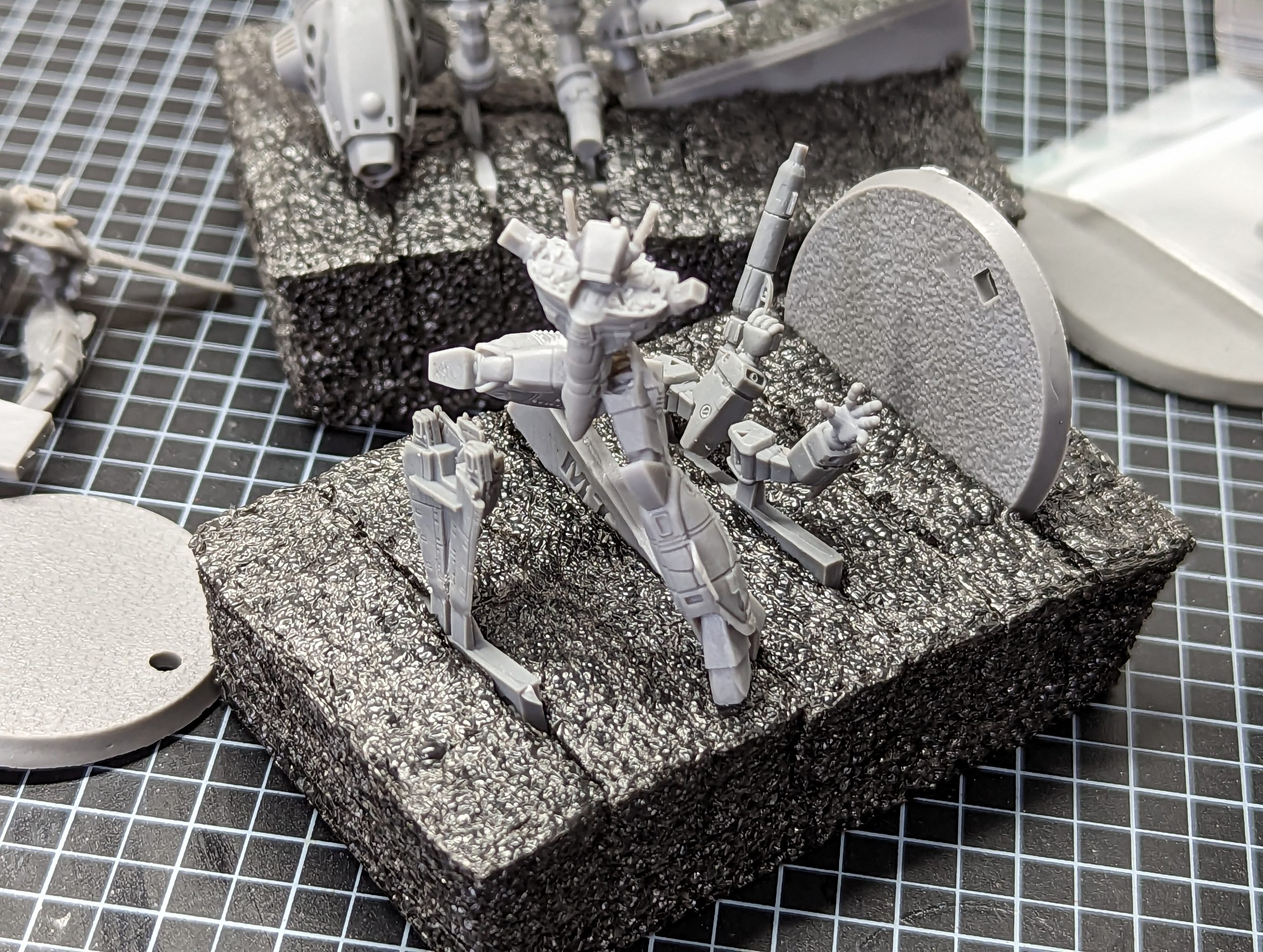 The miniatures are all resin, and there appears to be two distinct types, a slightly softer resin seen in the Rick Hunter Valkyrie various modes, and the type seen in the models like the Destroids, Skull Squadron Battloid and some of the Zentradi. There also appears to be an intermediate, less soft version of the first resin, though this may be caused by improved sculpting and casting.