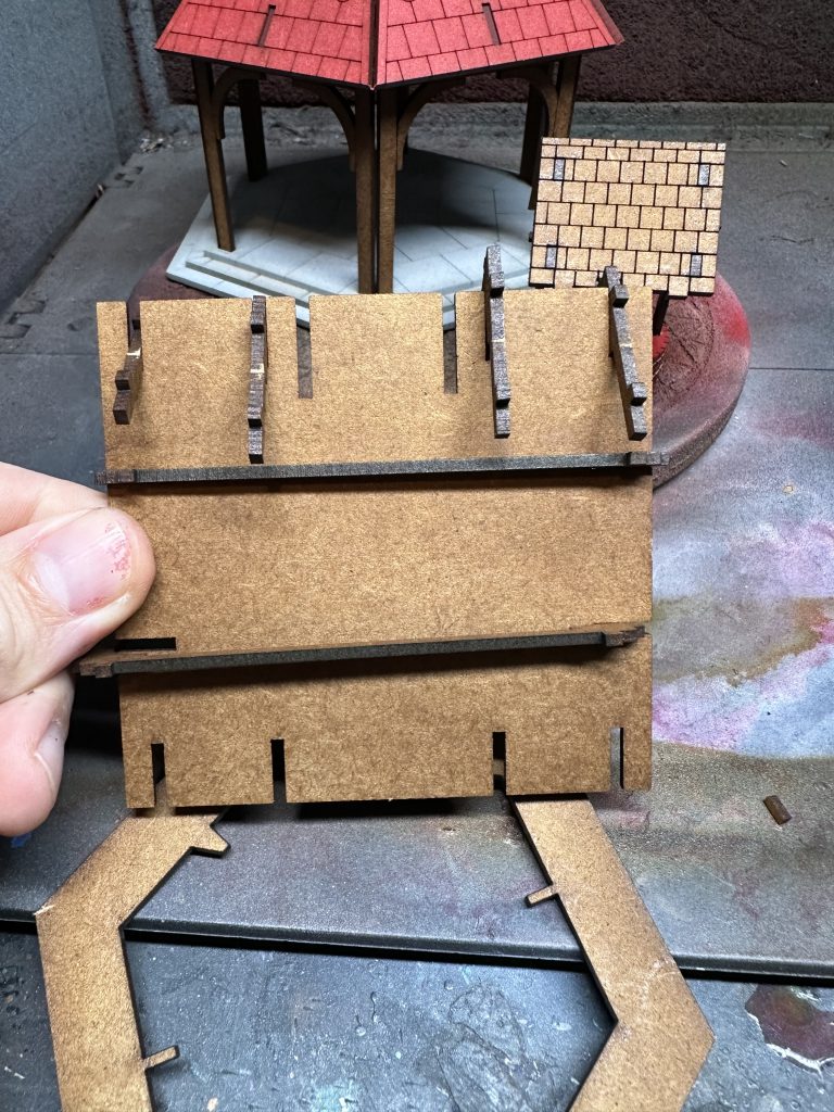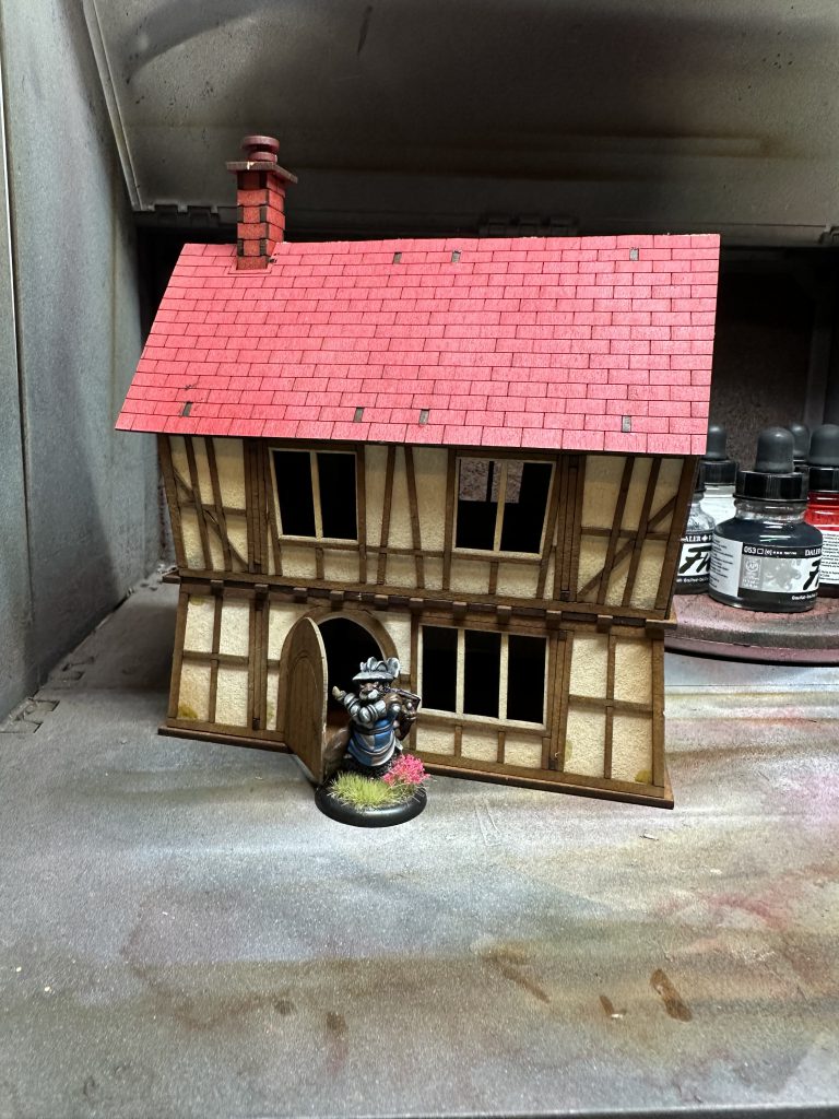 I made brief mention earlier of assembling painted pieces and I prefer to paint MDF without priming in most cases, airbrushing ink directly on to the boards. The pigment dense ink gives good coverage and a faster process than priming and then painting. I spent some time comparing various MDF processes back when I tackled the TTCombat Venetian Quarter. The only downside to this approach is that when it came to painting the chimney stacks, the laser cut surface of the MDF is quite smooth. It took longer than I would’ve liked to get a decent colour on the chimney and well, but I managed to get their eventually by spraying from slightly further away and allowing more time for drying to build layers up slowly.