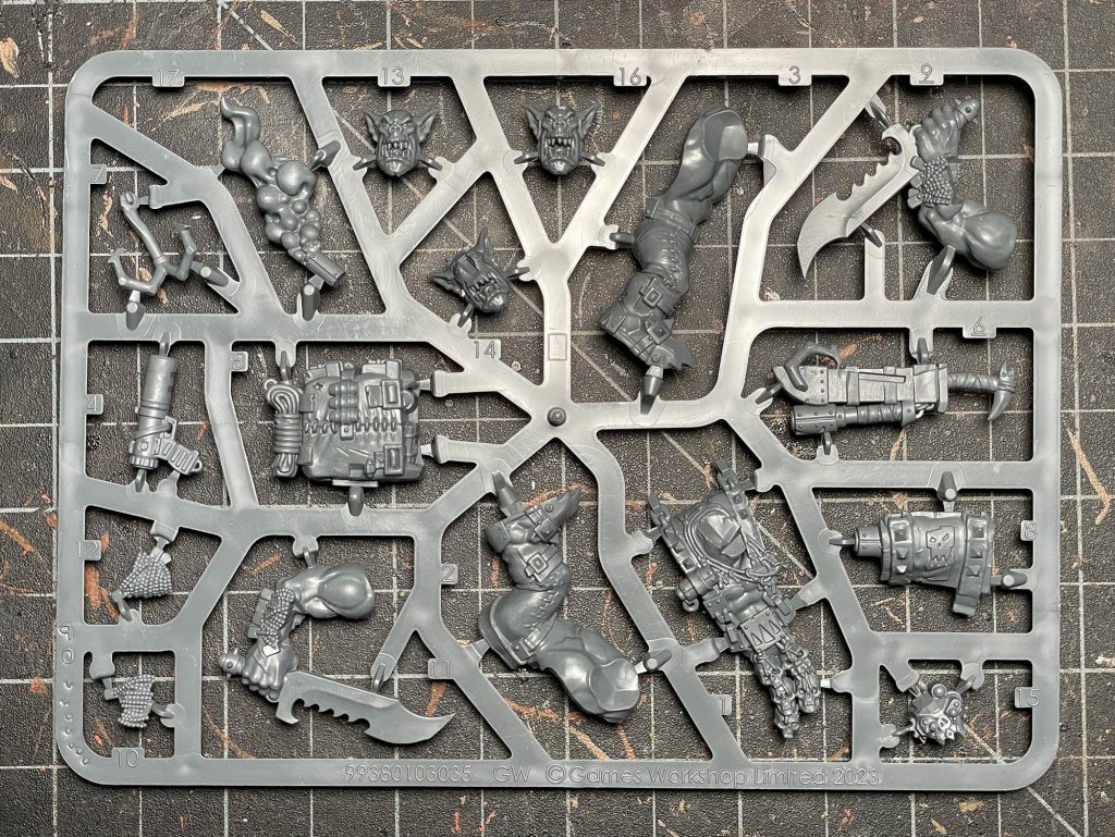 DYLON: Snikrot comes on a single sprue with 3 head options, mask on, mask up, or no mask, which is a neat feature for a named character. The designers clearly spent a good amount of time with the previous sculpt. The boots, belt buckle, knives, and arms wrapped in dog tags are nearly identical while the face mask is of a new design. His backpack has been updated to the modern ork aesthetic but he larger maintains the same equipment and he’s gained a pistol of a very large caliber. The details themselves are very well modeled and the textures are visually distinct.
