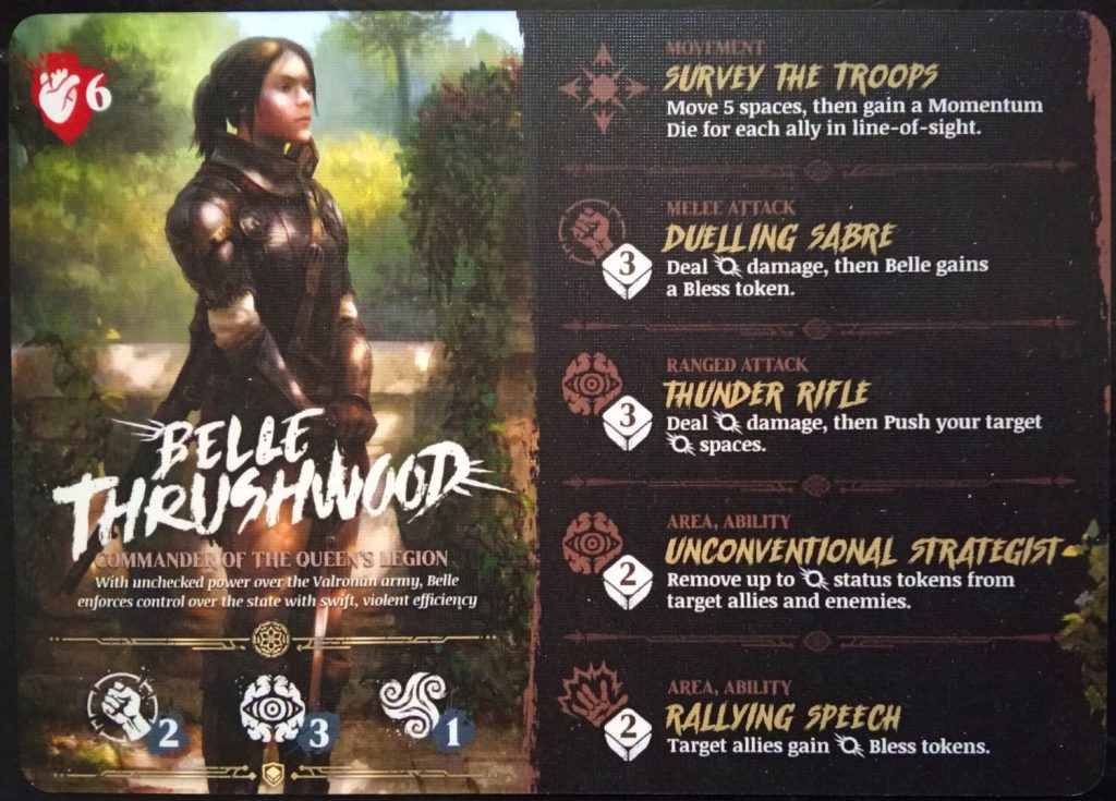 There are a variety of types of Actions, but starting with Attacks, you’ve got Melee (adjacent) and Ranged options. Generally, you’ll roll dice equal to the Action’s attack value (5 is the highest dice count I’ve seen attached to an Attack so far) and your opponent rolls dice equal to the relevant Defence (Attacks are typed as Mind, Body and Soul, and resisted by the correlated Defence stat), with every character having 1,2 and 3 being their Defence stats. This means there’s always a gap in the armour, and every character can be dragged down by the right attacks.