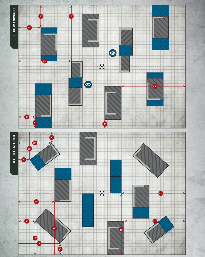 - Layout 7 sees the middlemost large ruins shift 3” vertically and 1” horizontally towards the center, and the smaller 4x6 area that used to be attached to them is now attached to the outermost large ruins against the board edge. The other central ruins, the ones with the 4x6 and 5x10 areas connected, shift 3” vertically away from the center to keep the movement lane about the same size as before. This opens up small firing lanes on the outer middle sections of the board, makes the central firing lanes less steep, and gives you more room to protect your deployment zone on short edge deployments