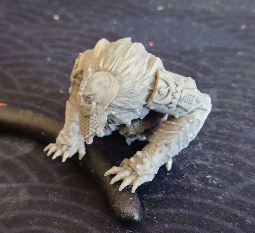 love these qualities. The model came off the plate with few issues and cleaned up well. My support settings were still unrefined and there was significant support scarring that I worked over with modelling putty. Importantly, the constituent parts were arranged so that support scarring would be placed in less noticeable lower areas. Unlike the Lion of Jabir, this file was made for filament or resin and it shows.