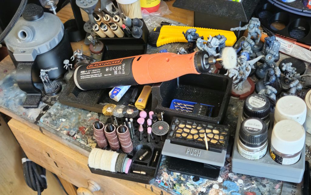 Some of my printed hobby desk items. Left to right: Airbrush cleaning pot, tool organizer; rotary tool stand; rotary tool bit storage tray; toothpick dispenser; pigment holder