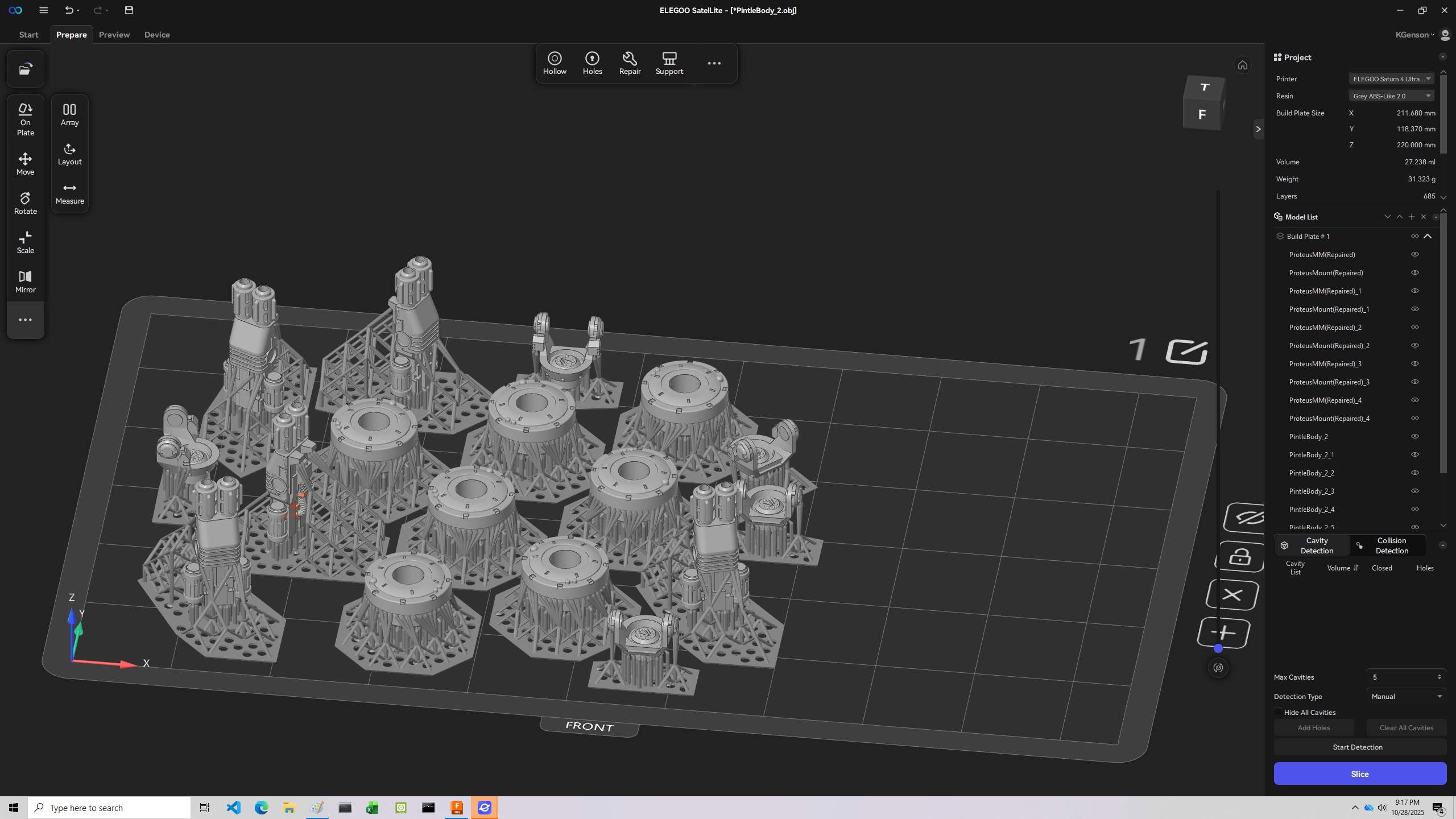 Mostbergminis on Cults3D. SatelLite downloaded the specs for the printer and the ABS 2.0 resin without a problem, and from there I set orientation and support without a hitch. SatelLite found the printer on the network and sent the part over.