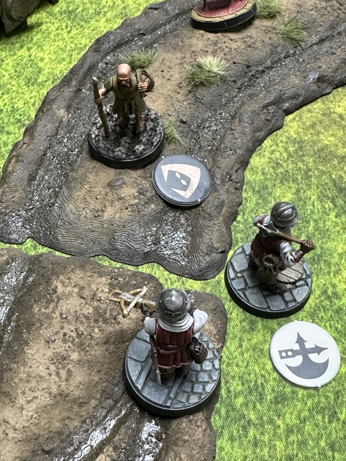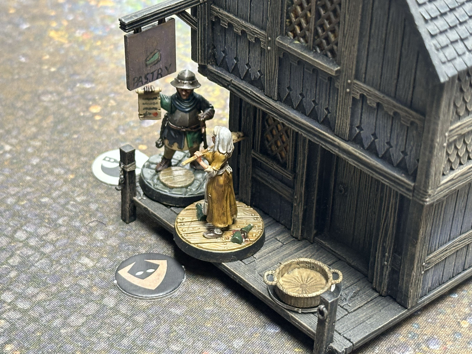 The guidance for terrain is similarly open. "Patrol Duty", the standard mission in the game that provides the filler for more specialized missions, specifies between three and nine buildings for a 3x3 board. That's a wildly different level of crowding. In addition to large, freestanding structures, I also think that gameplay calls for a lot of scatter terrain, and genuinely benefits from someone going a little wild with carts, merchant stalls, barrels and an errant flock of chickens.