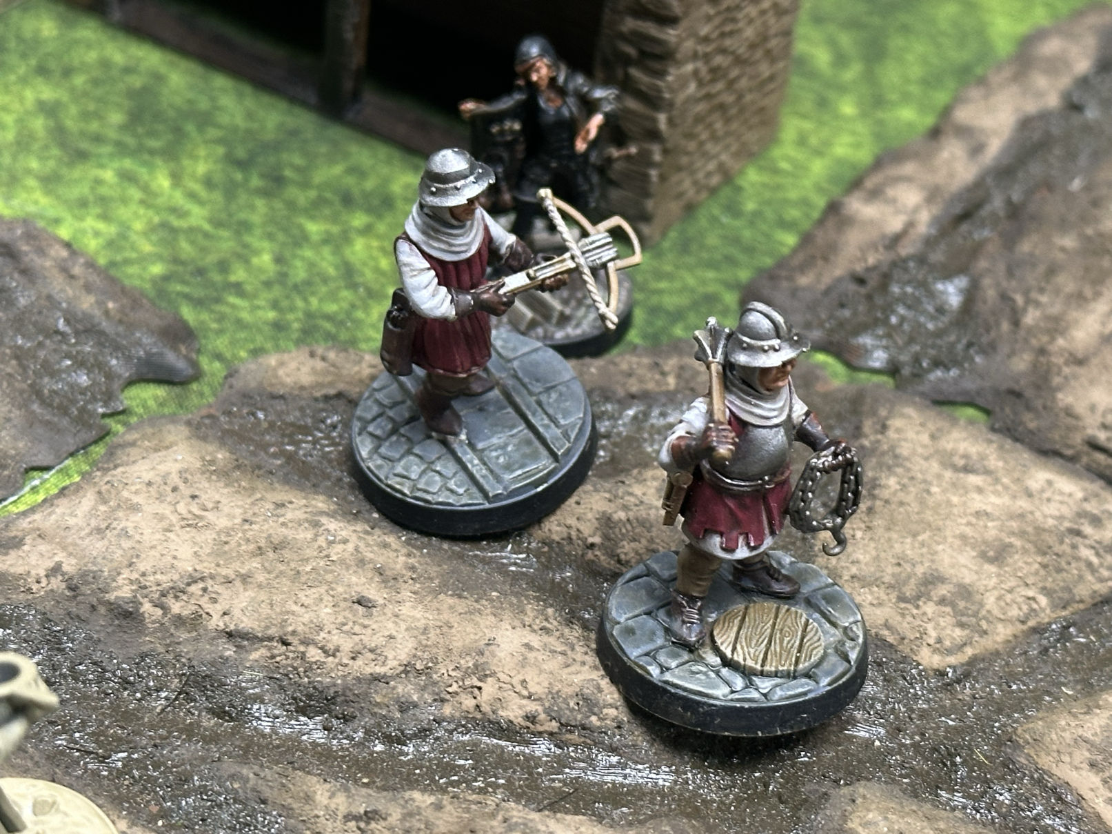 Two guards and a civilian all from the Wargames Atlantic Classic Fantasy range. Credit: Eric Lofgren, models by Calvin at Nevermore Painting Studio.