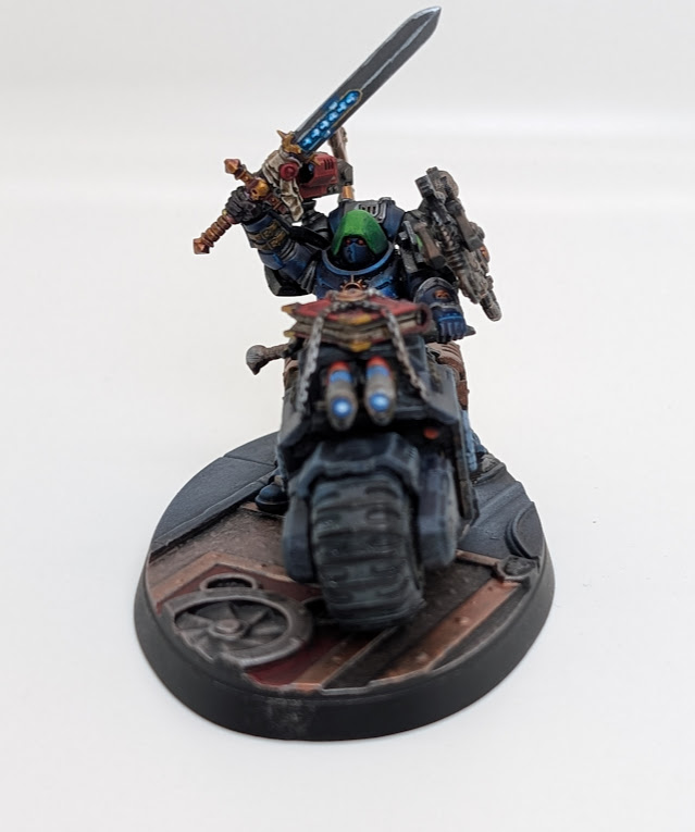While I hadn’t painted a new Dark Angels model in over a year, the last models I painted were Outriders so I had that recipe written down. The problem for me was to figure out the accent color scheme: While the bike was going to be Ravenwing black, the Dark Angel himself was a Techmarine *and* Librarian. And was going to have a green hood to match how I had painted that headsculpt-type on the rest of the army. So how was I going to balance Techmarine red and Librarian blue? Stumped, I asked Greg. Greg solved the problem surprisingly quickly: Techmarines would not be allowed into the Inner Circle because of their allegiance to Mars. That solved the problem: the Librarian would be blue (except for his Dark Angels green shoulder pads and hood), with red accents. Plus, this meant he could service all my Horus Heresy-era technology for which the Adeptus Mechanicus does not provide rules.