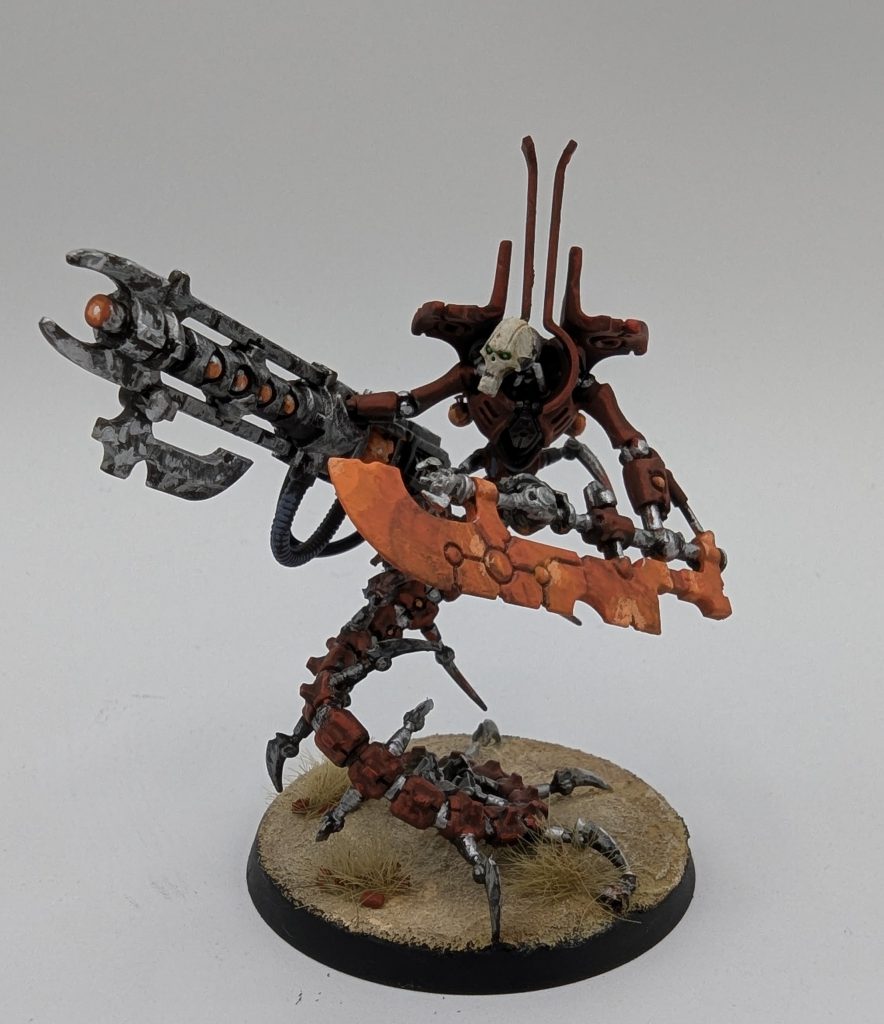 Norman: Those who’ve been listening to our Patron only podcast HAMs Radio will know I’ve been working hard on a heavily converted destroyer/flayed one focused Necron force for this year. So naturally when I saw these rules I knew I was absolutely going to build an Ophydian Lord. for the kitbash its a combination of the Geomancer kit, a gun from the Heavy Lokhust Destroyer kit to represent either a Gauss Destructor or Enmitic Exterminator, and the Reaper Phase Blade from the Skhorpek kit to represent a Hyperphase Harvester or Voidscythe if I’m feeling particularly sweaty. The head is just a random warrior head, but that’s kind of how all the destroyers are. For his ability I gave him United in Destruction, because he’s a destroyer obviously and loves that sort of thing. All that said, meet Lor’tak, the Flensing King.