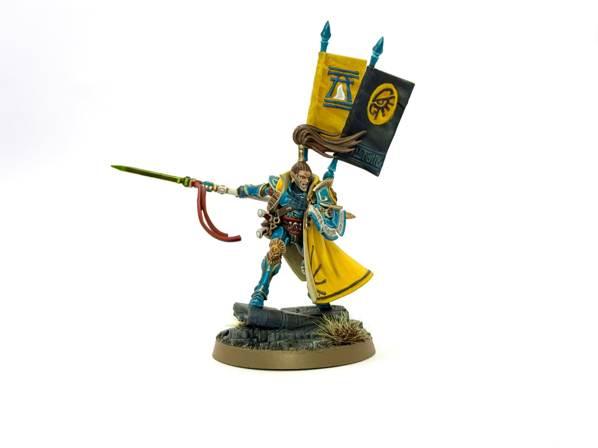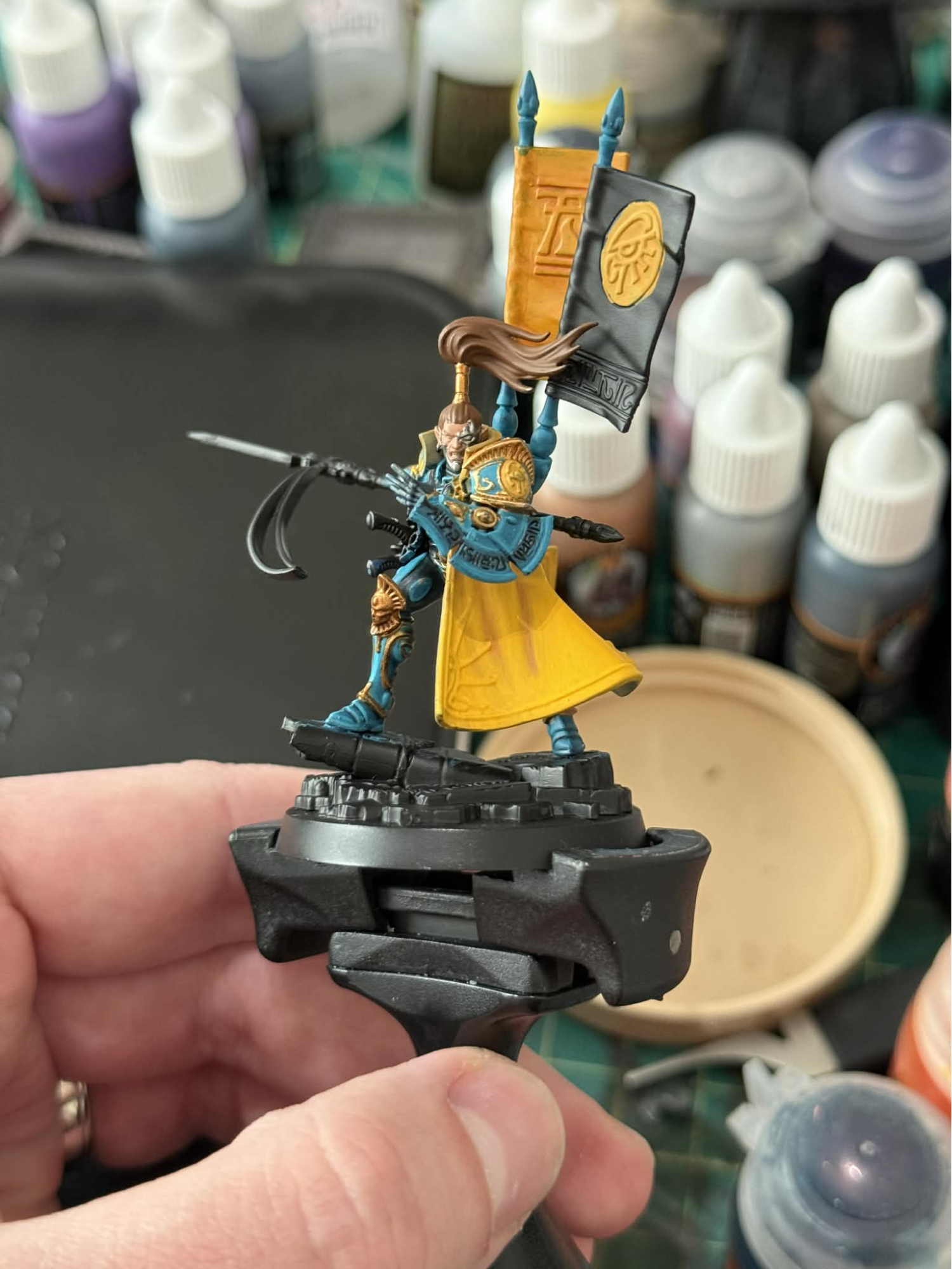Since Yriel first struck my imagination thanks to his defense of Iyanden, I decided to pay homage by painting him up with a yellow cape to highlight his corsair blues. Painting yellow isn’t something I do often for good reason- it’s famously frustrating and requires many layers to look smooth. I love painting capes though, and once the initial base coat was down painting the highlights up really wasn’t too painful. Plus, it looks great when the job is done!