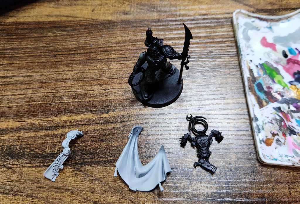 The Lord Exultant is pretty straightforward to assemble but he's got a number of bits that are a real pain in the ass to work around - specifically his combo cloak/tabard/toga doubles as his right shoulder pad, and glues together in two pieces at the top of his shoulder, with the draped cloak connecting on the left side at the bottom corner of his shoulder pad there. Because of this, when I painted him I decided to use a four-part sub-assembly: