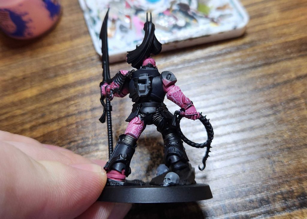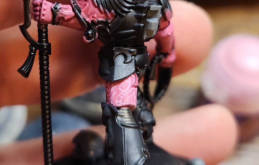 Fulgrim Pink, thinned and painted over the base pink, which is a shade of Pink Horror to Emperor's Children. I don't have a set idea in mind when painting these; I just know they need to be organic, swirling shapes. A good reference point for these is looking at the etched designs on ornate suits of armor from the late Medieval and Rennaisance periods.