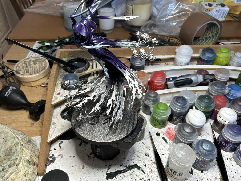 Paint-wise, I wanted to try doing something like the fade effect between the robes and the glowing necron-ness that the box art had, and used a contrast wet blend to do this. My process was to spray the whole model Leadbelcher, then fill in the purple down as far as I wanted it to go with a normal Naggaroth > Druchii violet recipe.