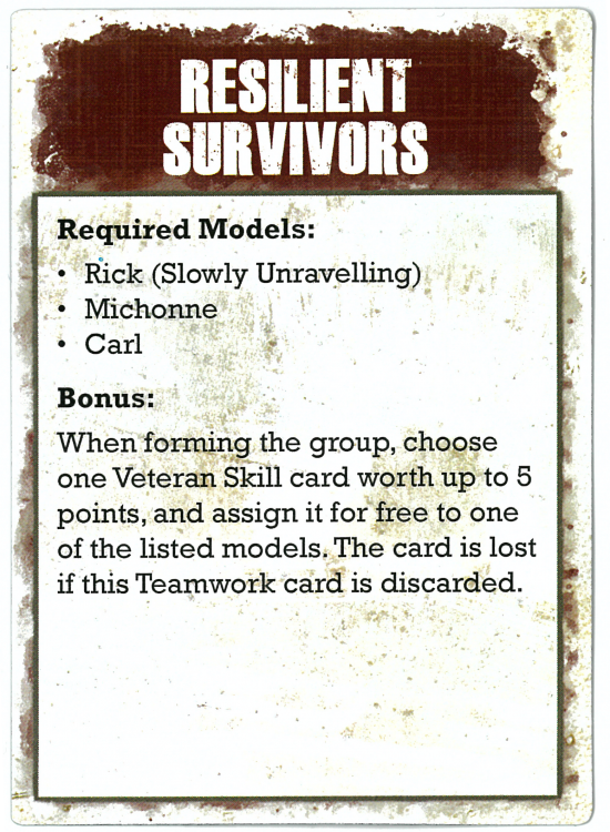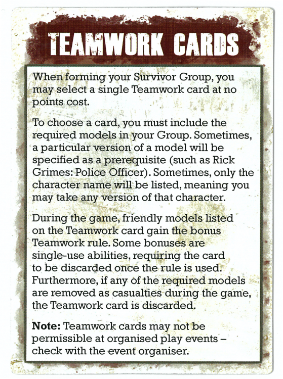 Teamwork cards fit in nicely as a small boost but not something that skews a force tremendously or changes how the game is played. You can take one Teamwork card for free as long as you include the models noted in it. I've looked through all of them and many of them add new elements to the game that aren't just adding a currently existing special rule or giving bonus actions.