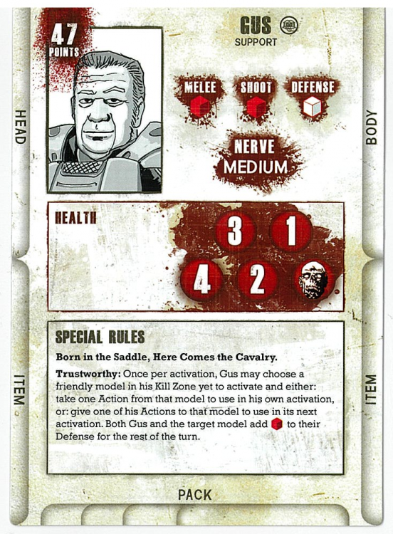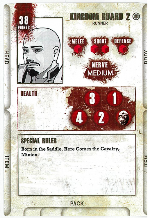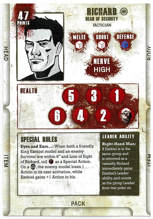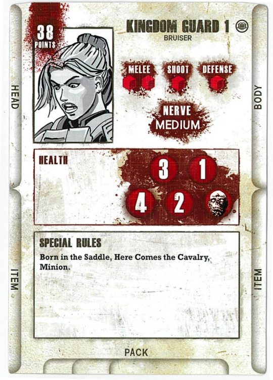 Richard is actually the only model in this release not a horse, but he's still great. He has six Health, two higher than the others. His stats are exceptional - 1 White in Melee and Shoot, and 1 Blue in Defense, providing another tanky model to a pretty tanky faction. It may be worth investing in a horse for this guy so you can get him across the board with the others, but you'd also want to horse up Ezekiel then as well because Richard's special rule