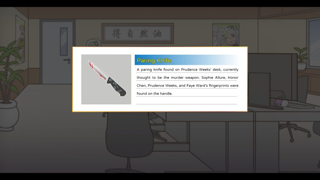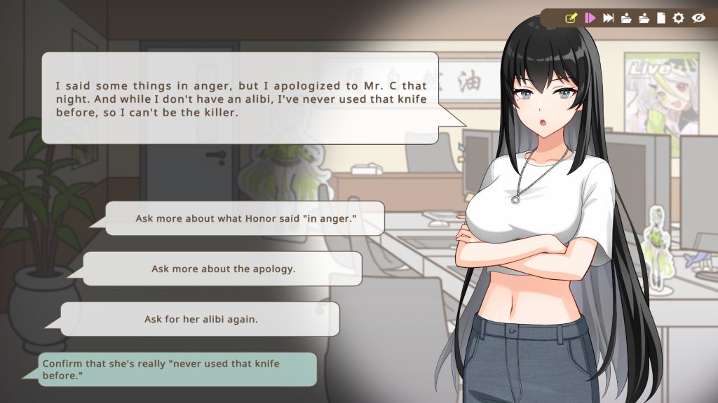 The Real Face of a VTuber begins with the murder of the president of a VTuber company that is responsible for managing the wildly popular talent named "Kuripa", and prosecutor Justin Truth (you) are tasked with discovering who killed the president and why from amongst the staff of Lilien Entertainment, as well as figuring out the real person behind "Kuripa" and how her true identity plays into the solution to the mystery. There are various red herrings you can fall into and determining the real killer and their motives will lead you to the solution, but getting there requires careful attention to details.