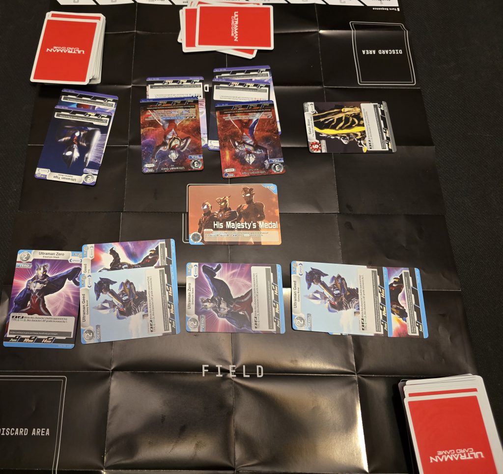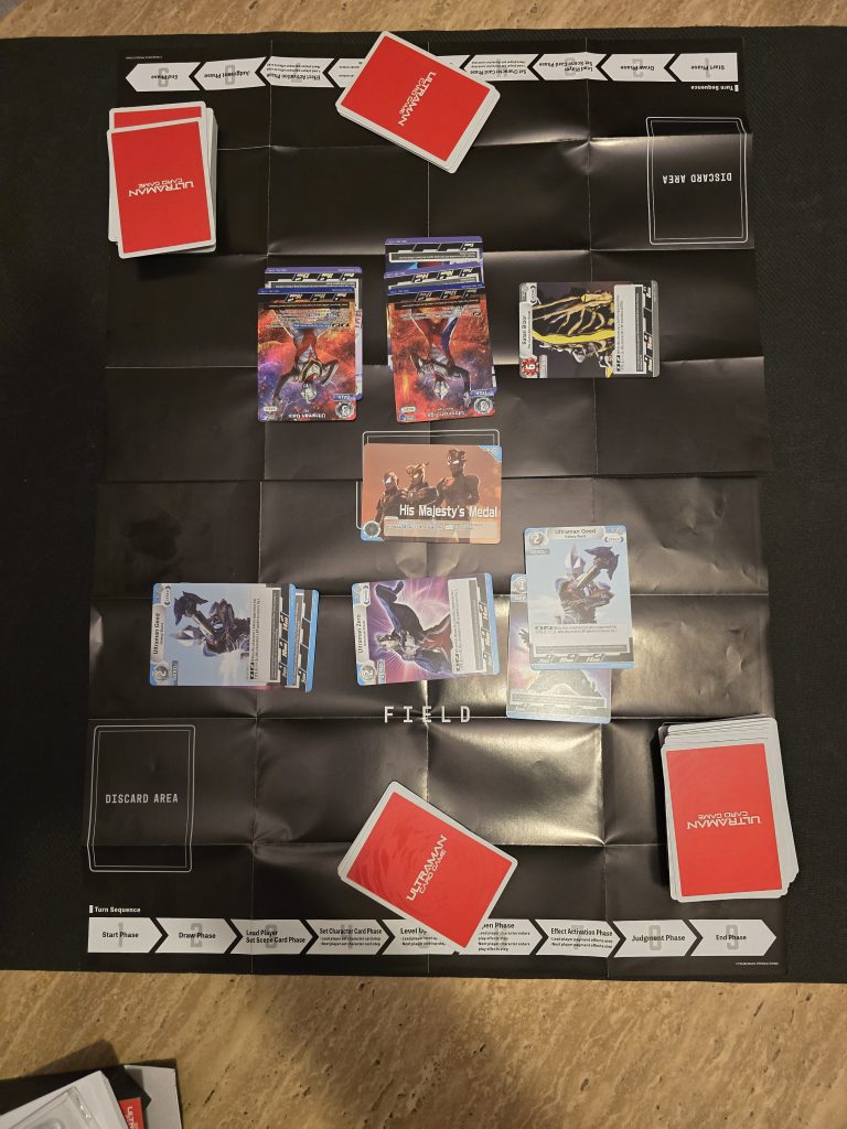 Perhaps because I was predisposed to love Ultraman related things by nature of being a fan, I wanted to see whether we’d want to return to the game at all after a few rounds of initial testing. I got my answer in a somewhat unexpected way, as during the course in which I had initially received the game, my partner and I had to take a fairly long trip, and on a whim I grabbed the Ultraman decks we had made and packed them along. We ended up having far more downtime than we initially expected, and I popped the game out of my travel bag and offered to play, which she eagerly agreed to.