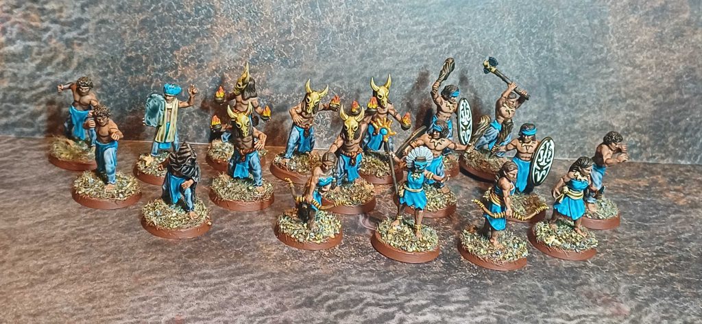List building is easy enough. Standard warband size is 20 models, and no more than half of that can be the same type of model. You’ll always need one (and only one!) Shaman as the leader. At that size of warband your playing surface will be a sensible 24x24 inches, making it an ideal kitchen table game. If you want to go with more models, you’ll need a bit more space at 36x36 inches. What you will need is lots of scenery to block lines of sight and cover about 50% of that play area. In this stone age fantasy you’re battling it out in jungles and other wild places. There are no roads or nicely cultivated fields. Luckily trees and woods are to be found in most wargamer's collections, and are fairly easy to make.