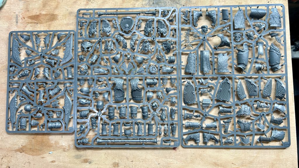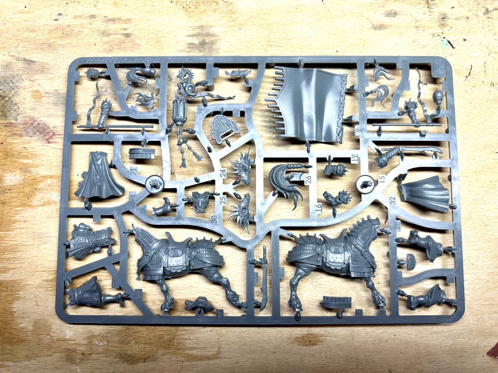 Initially I was taken aback by how straightforward these models are. The construction and posing seem very basic in modern terms, but swiftly I realised that of course these models need to rank up, which places limitations on the posing and sculpting of the model. With modern sculpting and casting improving all the time, I guess I have become used to the extremely dynamic poses in AoS and 40k both and these seem simplistic by comparison. That is not to say they aren’t lovely models, as they are and were a pleasure to build. I just haven’t built a horse with the ‘one foot up’ pose for like 20 years!? These models are super simple to assemble and I would call this a ‘lunchtime’ kit in fact. They do still benefit from developments in model design however, I was impressed by the multiple overlapping pieces that lock the standard into the pole, cleverly making that a very strong join where it could be weak. Nice kit.