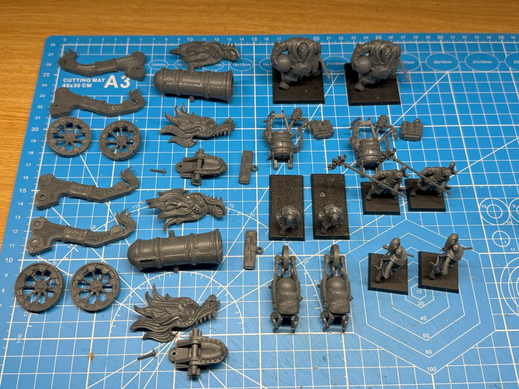 Because I'm picking up a second Battalion Box, I opted to do two Grand Cannons this time around. The subassemblies seem like overkill, but I want to paint the cannon body in a copper tone and the dragon detailing gold, which will be much easier to airbrush and then assemble after. Painting the crew will also necessitate tackling two wheelbarrows of gear and two ogre backpacks that include a couple of catfish. This is going to take a while...