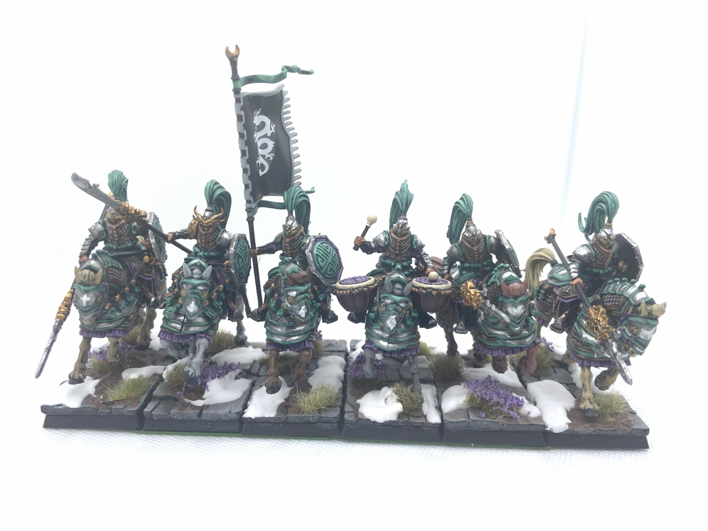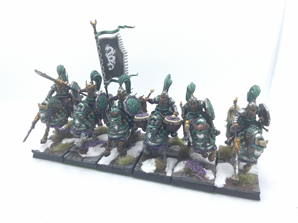 Liam: The Jade Lancers are the mounted option for the army on release and these only have a single weapon option with their Cathayan Lance and Shield combination. These have 8 Standard poses with the Champion, Standard and Musician being 3 of those, with their none-command alter-ego's being another 3. They're a really chunky model but do fit snugly on the bases, when building mine I've got some at slight angles to try and make it easier to fit them together in a unit around some models, especially the musician but is all but exactly those 30mm wide at their largest point. These can build fully prior to painting without much issue with only the area around the reigns proving a little challenging but apart from that they're just a really nice unit, similar to the Jade Warriors.