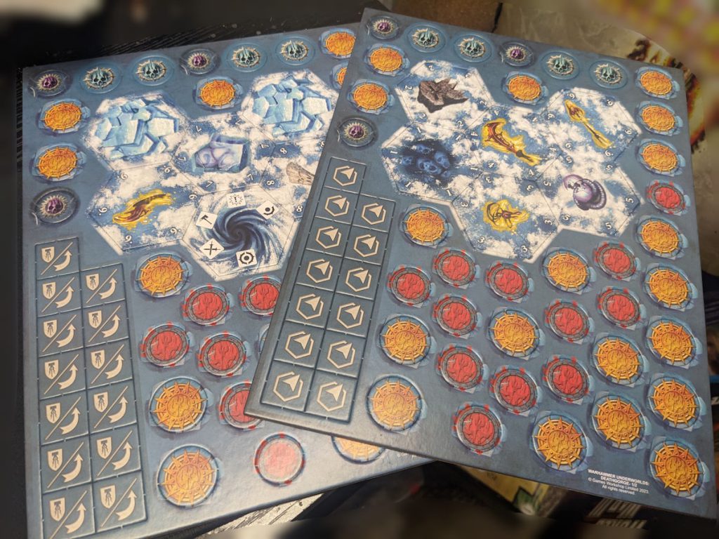 The included play boards are gorgeous. Again, they've upped their game with every release and these boards just scream 'ice filled caverns' at you. Each board is different with deployment locations, lethal, cover, blocked, and snare hexes. As you play your warband you'll figure out which one is best suited for the cards you're using.