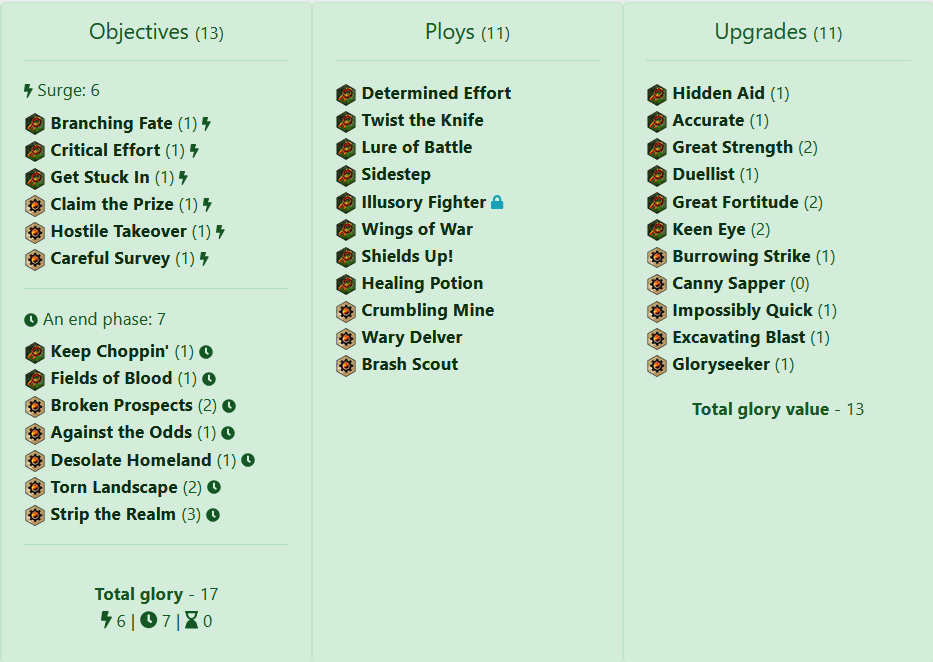 The objectives in Wrack & Ruin feel tight for this warband. Some of the staples will be difficult to achieve because your fighters aren't like to take damage and survive (Bloody and Bruised) or your mandatory pushes make them harder to achieve (Alone in the Dark). There are power cards here I'd love to have access to, but it would take some tinkering to make a workable deck. It could be another route to go for a control style deck pairing.