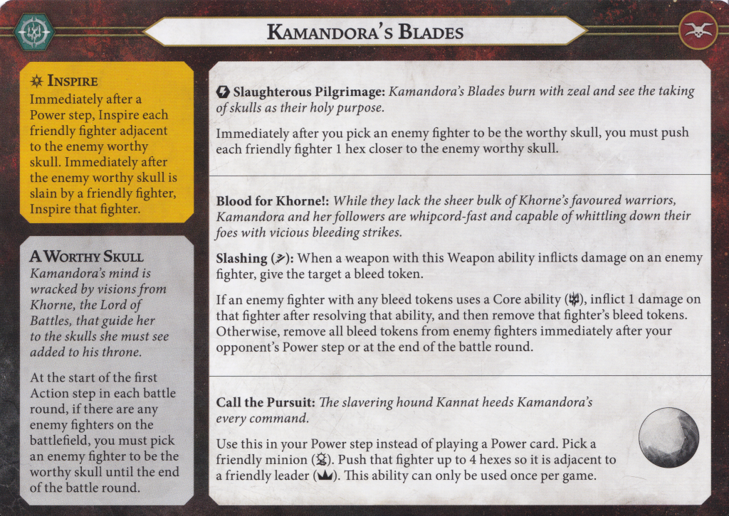 Call the Pursuit which is a highly restricted but very efficient push. This requires both your leader and Khorne dog to be alive (no mean feat considering how squishy both of those fighters are), be within 4 hexes of each other, and having a useful spot for the dog to land next to Kamandora. If all those criteria are fulfilled, you get a massive push for Kannat that leaves the dog free to charge, attack, or whatever at the end. You can't use it to set up supports for Kamandora if she is making a charge, but you can use it to set up for an inspire on Kannat if Kamandora charges the worthy skull target. I think using this early in the game is the best bet. If you try to save it until the perfect moment, one or both of the fighters will be dead or out of position.