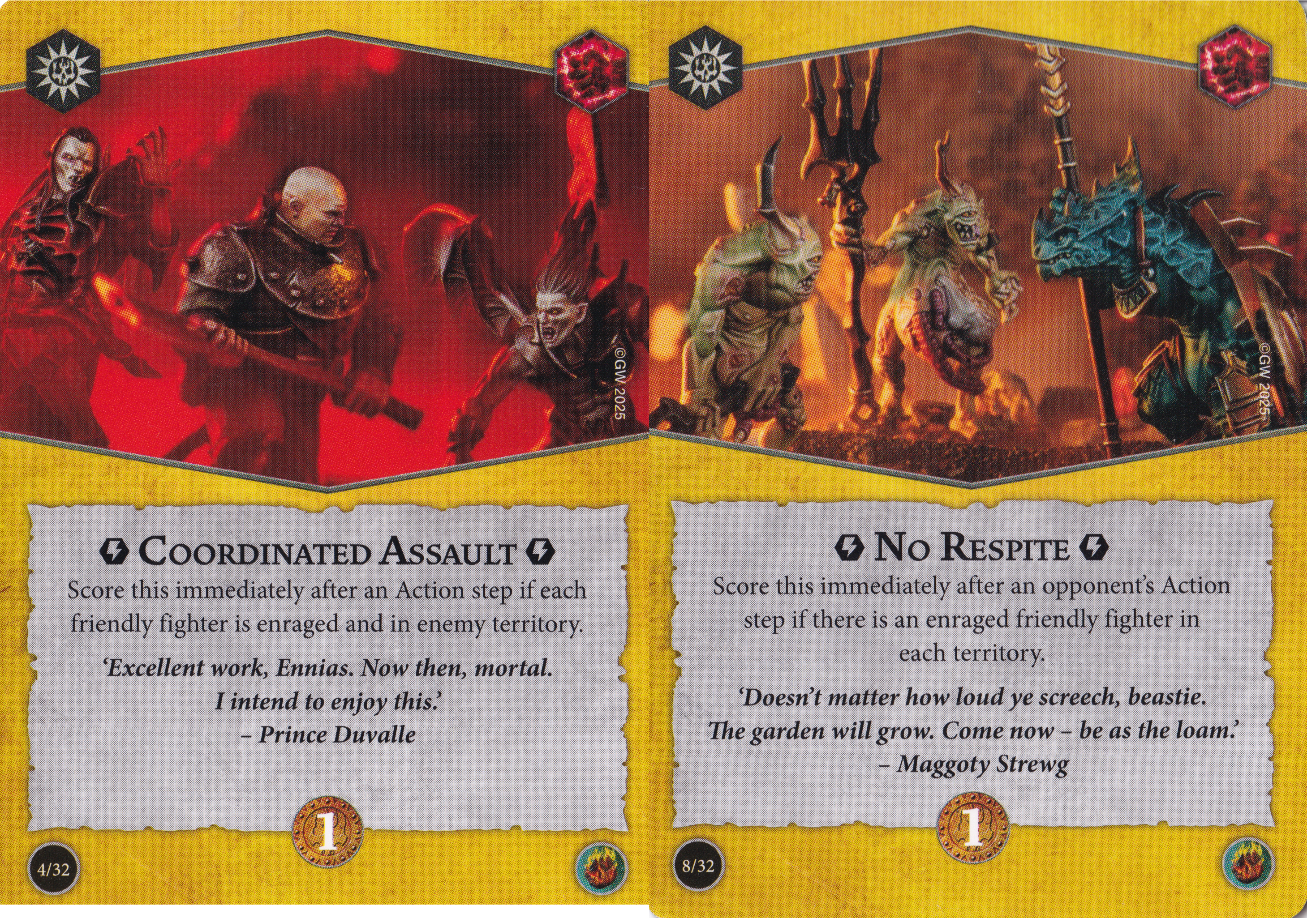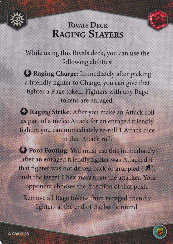 Raging Slayers has such a rough assortment of objectives that you absolutely need to pair it with another deck that can shoulder the load in that department. In addition to Best Foot Forward, I think you can take either No Respite or Coordinated Assault depending on how many fighters your warband has. The rest of the surges aren't ones I'm comfortable putting into my deck. For end phases, maybe some of the 1 glory ones to fill in gaps that your other deck has, but any of the higher payoffs are going to be difficult. The good (?) news is that by ignoring so many of the scoring options that require enraged fighters, you're much less punished for taking the power cards that remove rage tokens. Hooray?