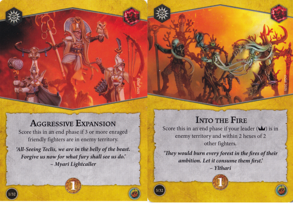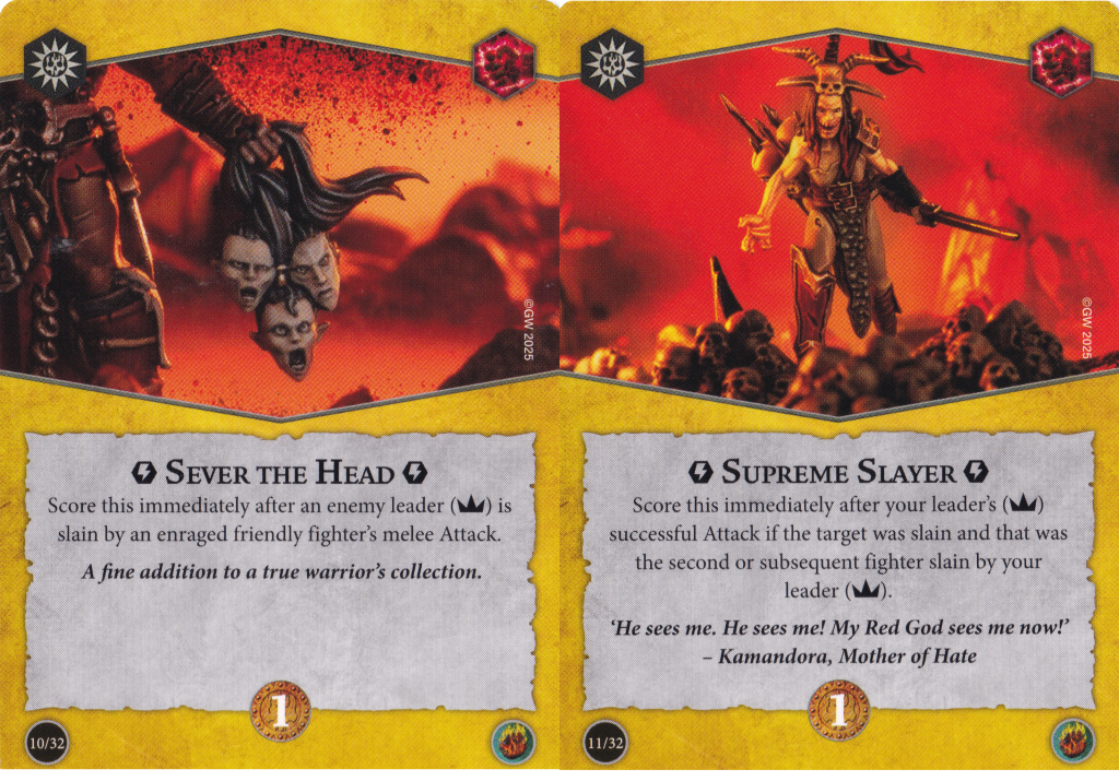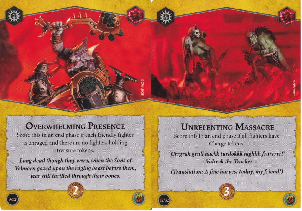 As far as warbands that would want this deck, the plot card already points you in the direction of warbands who will want to be charging and delivering melee attacks. I think if you want to include any of the rage token focused objectives in here, you'll want to make sure you have a bit of reach on your fighters – either a bunch of range 2 melee attacks like Gorechosen of Dromm (who also have a warscroll ability to help with scoring Unrelenting Massacre) or a warband with a healthy assortment of melee and ranged attacks like the Emberwatch or Farstriders. Having a little bit of extra reach will also ensure that when your fighters get pushed out of combat, they can still make follow up attacks without having to move.