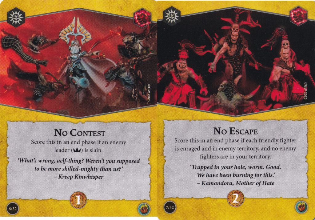 No Contest is, once again, about leaders. This time you want your opponent's leader to be slain. This is the type of leader killing objective that's more acceptable – there's no timing restriction, so you can knock off the leader in round 1 and still score this at the end of the game if you draw it. The difficulty will vary based on the opposing warband, but leaders often have a pretty big target on their heads anyway. Decent filler objective.