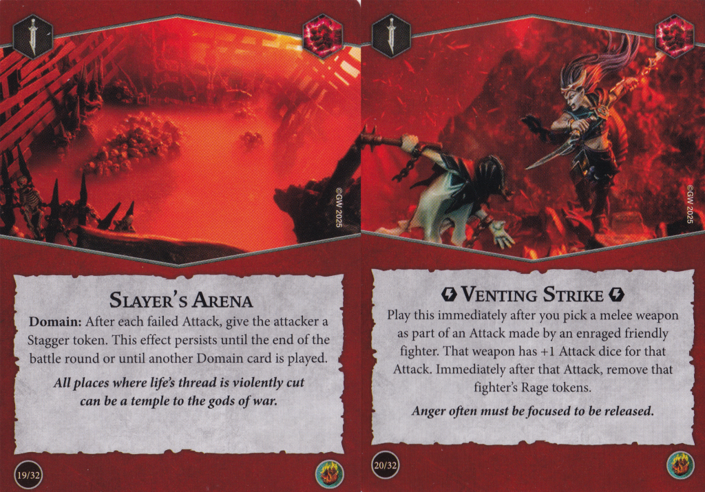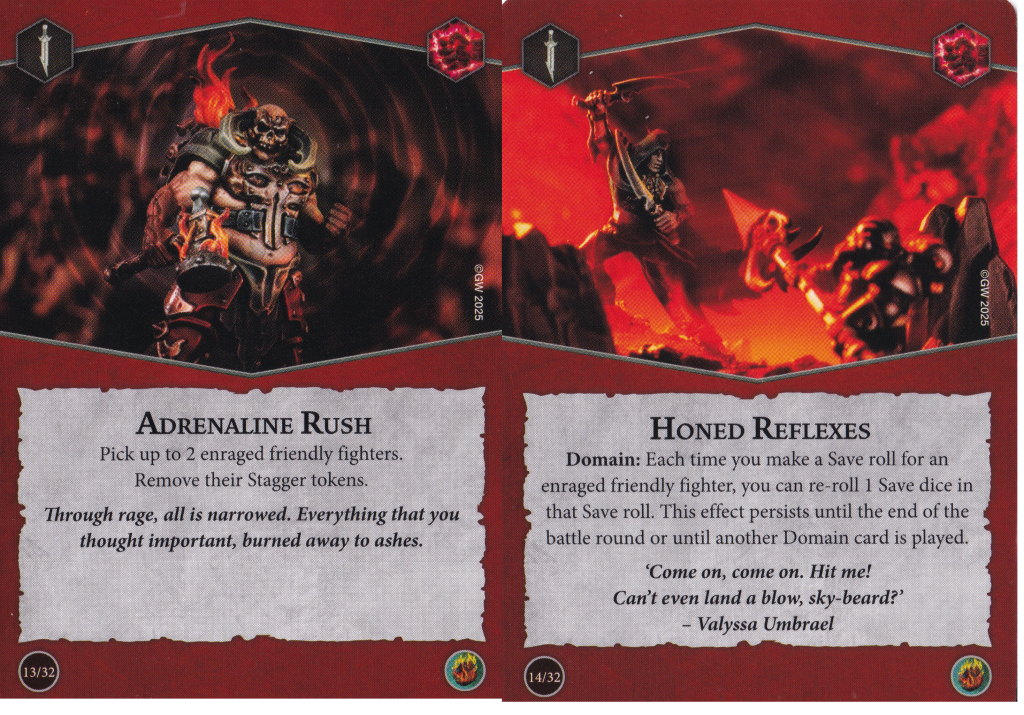 three(!) domain cards in this deck. We haven't had a deck with this many domains in it since the previous edition where that was a full theme of a deck. Anyway, this one is a doozy. It mirrors the plot card's re-roll on attacks and grants you a re-roll on save dice for any enraged fighters. This is huge and a massive boost to any fighter's survivability. Considering the enraged fighters are going to be the ones charging into danger, making them even tougher to take out is one hell of a benefit. This is a slam dunk inclusion in Nemesis decks.