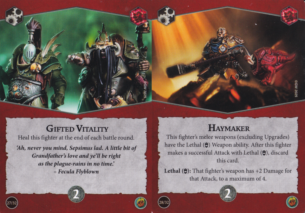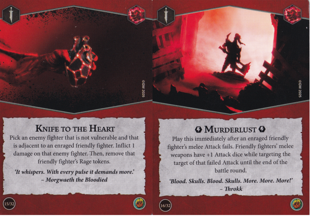 Murderlust, is kind of a consolation prize for one of your fighters failing a melee attack even after the coveted re-roll is used. You gain an extra attack dice on any subsequent melee attacks against that target for the remainder of the round. Fortunately this doesn't specify "other friendly fighters" so whoever whiffed their last attack can try to save face with an extra dice next turn, provided they can activate and the target hasn't moved away. I like how this incentivizes you to throw one of your more inaccurate fighters into the fray first to set things up for a follow-up. I can foresee some mixed emotions when your inaccurate attacks wind up hitting and this card just hangs out in your hand for longer than you'd want, but I guess that's not a terrible problem to have.