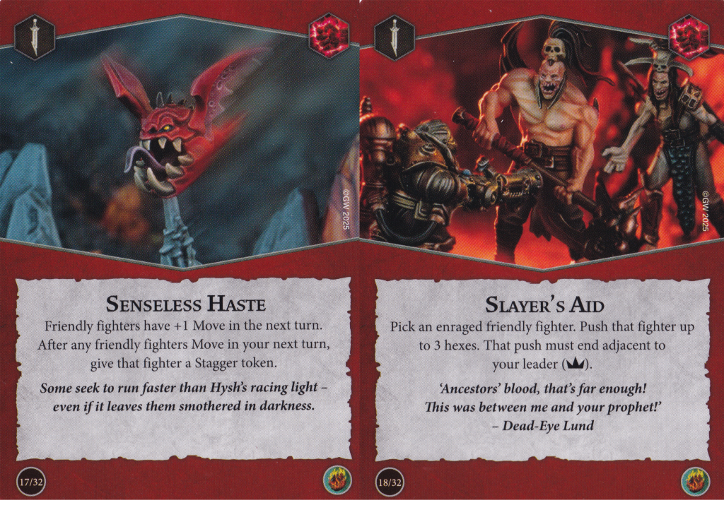 Senseless Haste is what this deck brings. Here is one of those ploys that results in your own fighters being staggered, and the upside for that is… +1 move. It's less than Wings of War and only usable once instead of an upgrade like Great Speed, but the wording does mean it applies to every move you make in the next turn. Hexbane's dogs, for instance, would gain the bonus as well as one of the hunters but they would both get staggered. Any effects played in the power step would also retain this bonus since it lasts for the next turn and not just the action step. Still, steep cost for a relatively small boost.