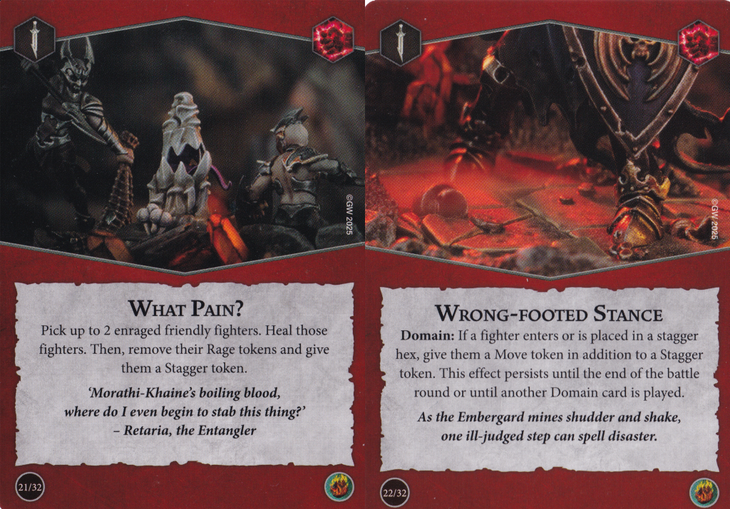 Wrong-footed Stance is our last domain ploy. To say this is a narrow use case card is an understatement. I guess if the opponent has fighters hanging out around stagger hexes, you can drive them back into it or use Violent Blast from Countdown to Cataclysm to sneak some move tokens onto their fighters. I guess it could set up your own scoring if you pair with Reckless Fury and take Savage Sprinter to get two move tokens on the same fighter at once... Very niche card, for sure.