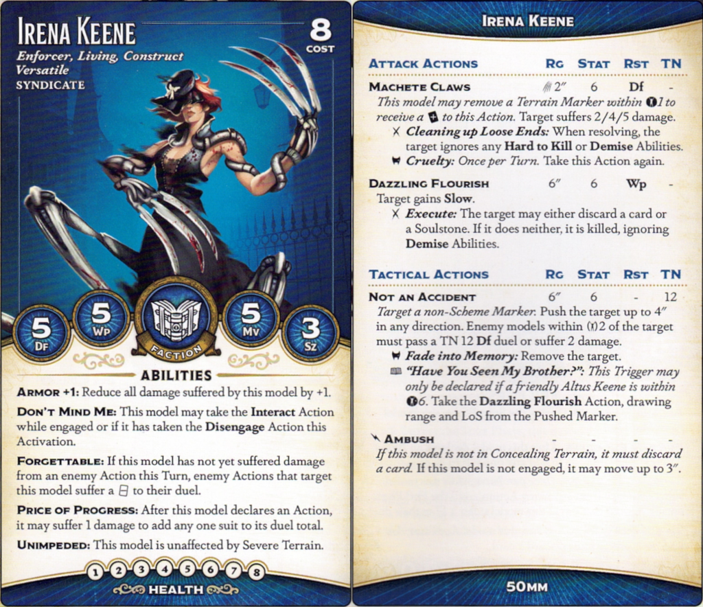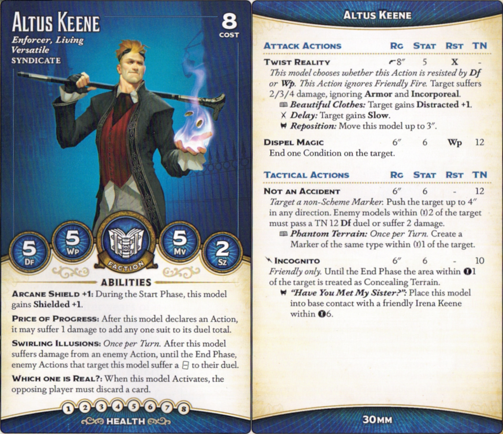 Altus’s Tacticals are… interesting, to say the least. Incognito is very very cool, given how many Syndicate models have Flexible Morality; normally, people can avoid the hand pressure by just Focusing, and Altus turns that off. He may be worth taking just for that (and note that a Concealed Winston is a nightmare to shoot, and this ability stacking with Swirling Illusions may be enough to keep Altus safe, but relies on you taking one to the chin). The trigger is cute, since a 6″-plus-base-size place is a lot for a bonus action, and since Irena is pretty good you'll probably take the siblings together quite a bit.