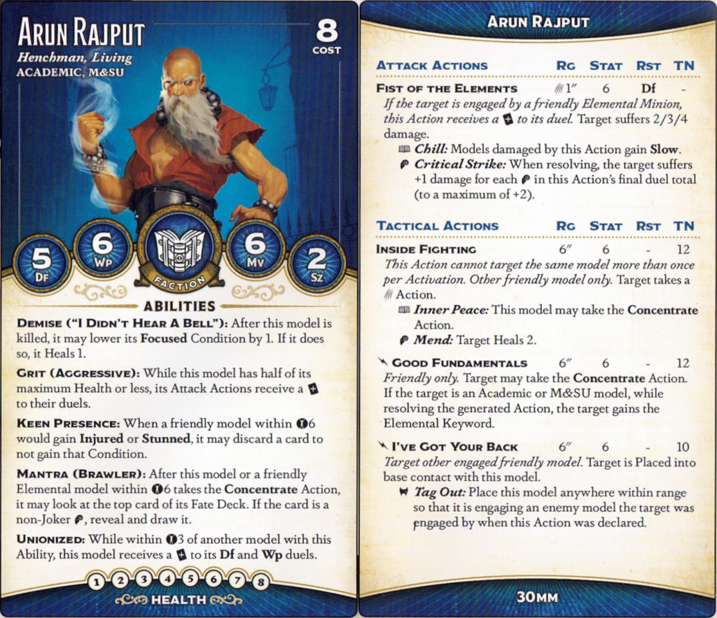 Arun's an interesting toolbox of a Henchman. His unique Demise, "I Didn't Hear a Bell," lets him trade Focus for life. While you can never carry more than two Focus, he can pretty easily Concentrate once per activation without having to give up an AP for it (whether through Good Fundamentals or the trigger on Inside Fighting. His melee attack is