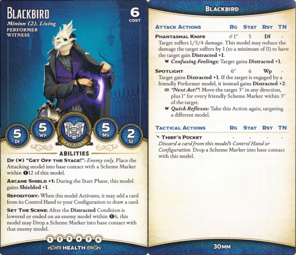 Shadowlark, aka Tina Grenville, is quite cheap for a Henchman at 7 stones. She's basically an upgunned Blackbird - a bit faster, with Diving Charge for maneuverability and Don't Mind Me to up the scheming ante. She's