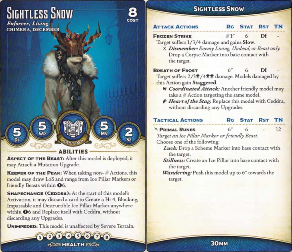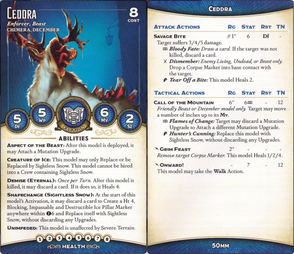 nasty. This is only the second Breath of Frost we've seen, and the first Stat 6, and it's much, much scarier than its Firey equivalent. Especially here, where the 6" range is mitigated by the ability to cast it through an Ice Pillar - you can reach out and touch someone 13" away, plus blasts. The attack's triggers are great, too, either giving someone a free attack (which, if you're playing her with Rasputina2 and channeling through the Ice Pillar, can be Raspy herself) or transforming into Ceddra
