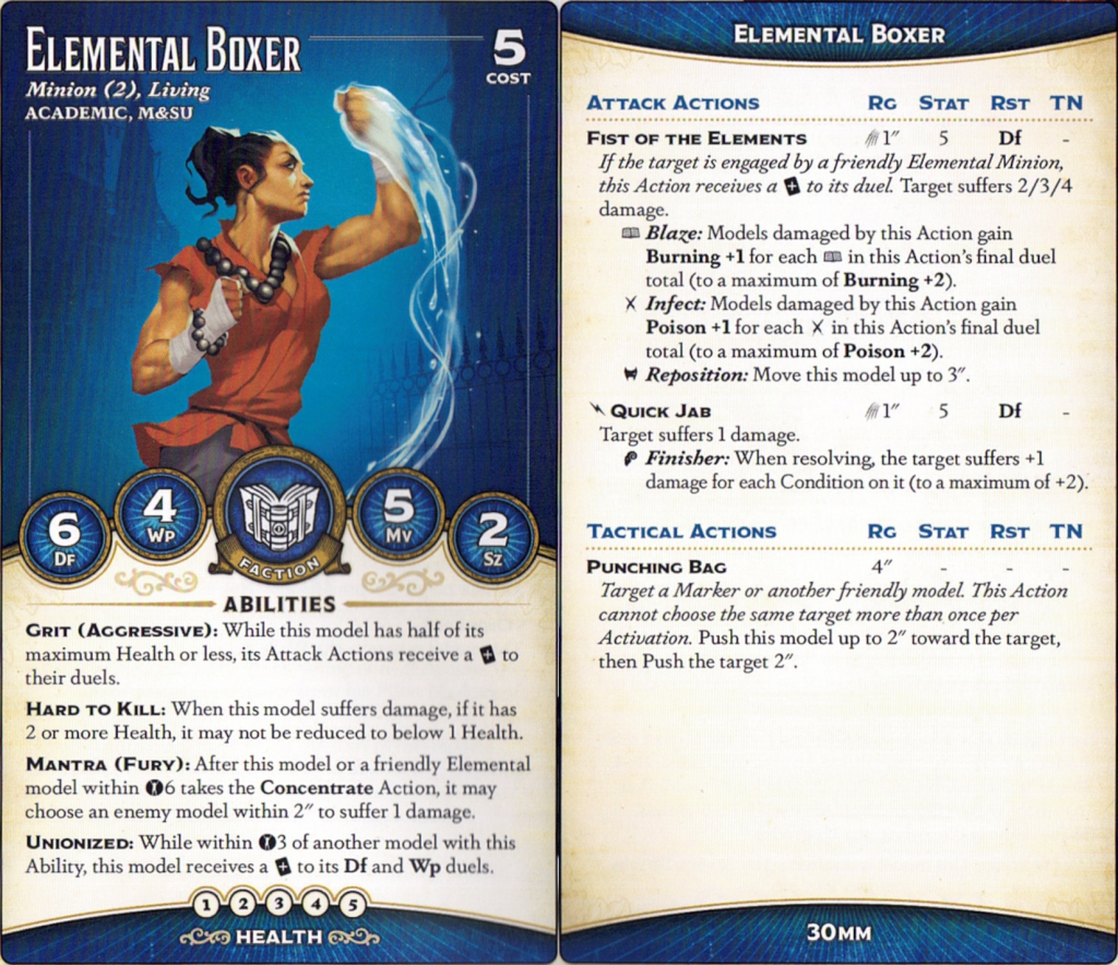 Arun comes with some students, too! In Elemental/Academic, these guys enable Arun's Unionized ability, which is pretty nice. Elemental Boxers have the classic 5-stone minion problem (i.e. they just die), although a less severe case than some others due to their Hard to Kill and Df 6. If my opponent's keyword didn't attack Willpower much - something like Family or Pig - I'd feel a lot better about hiring these little dudes.