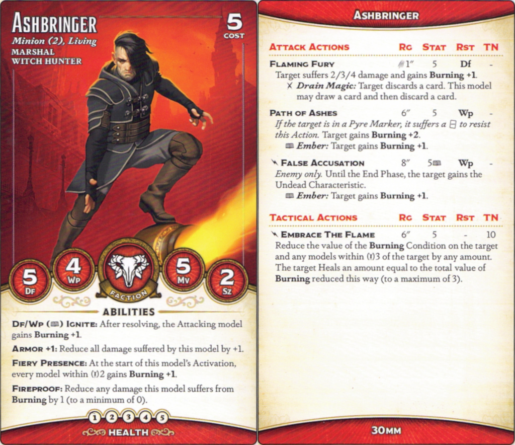 His attacks are absolutely top notch. Flaming Fist is a beatstick-standard 3/4/5 Stat 6, with the first swing being sort of an effective 4/5/6 due to the Burning (with a delay, of course. The triggers are both excellent, too; Cleansing Strike just lets you clear Focused or Fast or Shielded from your target (or Burning or Poison, for the crews that like those conditions), while Rising Flames makes you a