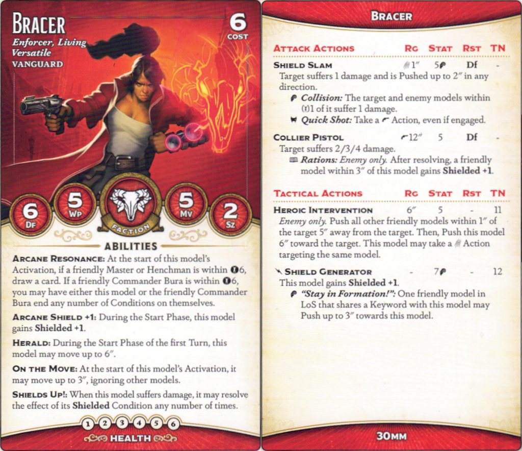Commander Bura's loyal second, Bracer, doesn't have her leader's natural aptitude for shielding magic, but makes up for it with technology and aggression. The Enforcer in the Starter Box, Bracer is all about mobility - between Herald and On the Move, she can get