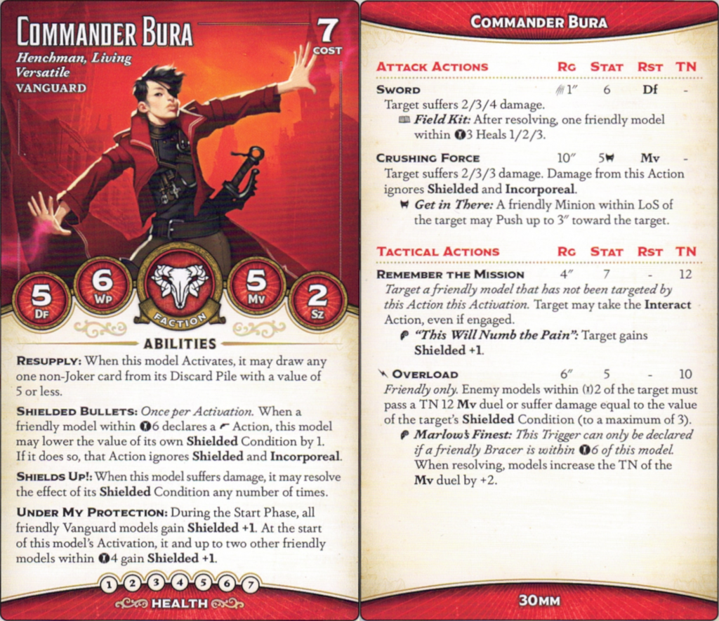 option to apply Shielded any number of times, so you can no-sell a huge attack or simply whittle it down low, knowing that you have some healing incoming on your next activation. This is a bit of a build-around but it’s a tremendous asset and one that makes Bura much tankier than her 5/6/7 defensive stats indicate.