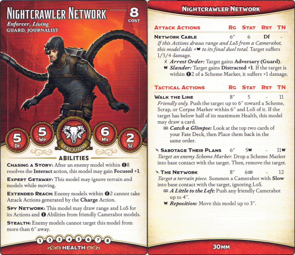 Spy Network is a frankly insane ability. It gives you incredible board coverage, making it super easy to attack wherever you need, and making stacking Focused with Chasing a Story very easy. His actual attack and tactical actions are pretty good, too: Network Cable is unimpressive unless Focused, but as mentioned, getting Focus here is pretty easy if the scheme pool requires Interacts; and the built-in Slander trigger makes it a
