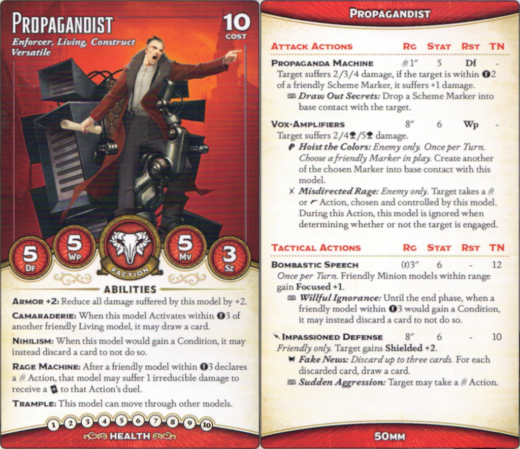 The Guild's ten-stone versatile beatstick... isn't much of a beatstick at all, really. He's pretty hard to evaluate. Armor +2 is one of those weird rules that tends to deform a model's card around it; if an enemy doesn't have anti-Armor tech, it's very difficult to chew through, but if they do then armored models tend to go down quickly. And if you're playing Guild, your opponent is going to being anti-armor a lot of the time. Still, Nihilism is surprisingly good defensive tech - not only is it immunity to damage from Burning or Poison (if you want), it lets you dodge Injured, Staggered, and Slow, all conditions that tend to set up a kill.